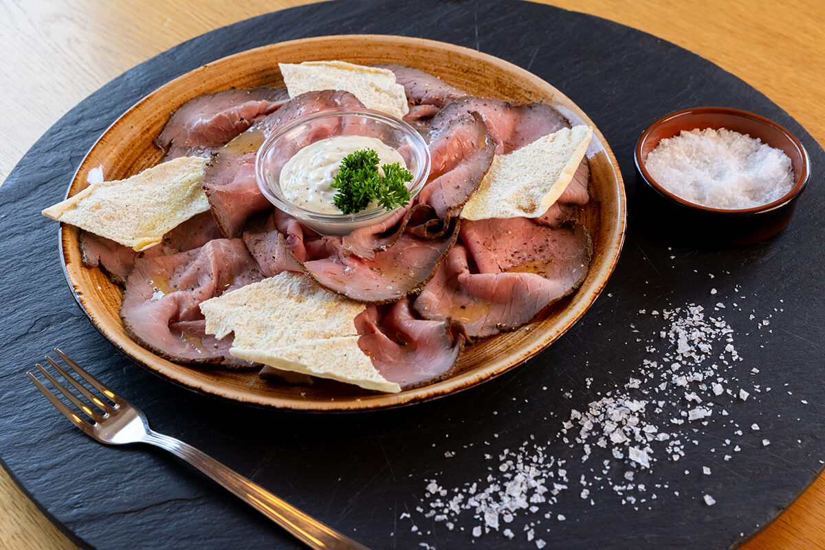 | ROASTBEEF TELLER MIT TARTAR SAUCE serviert mit Pommes Frites  |