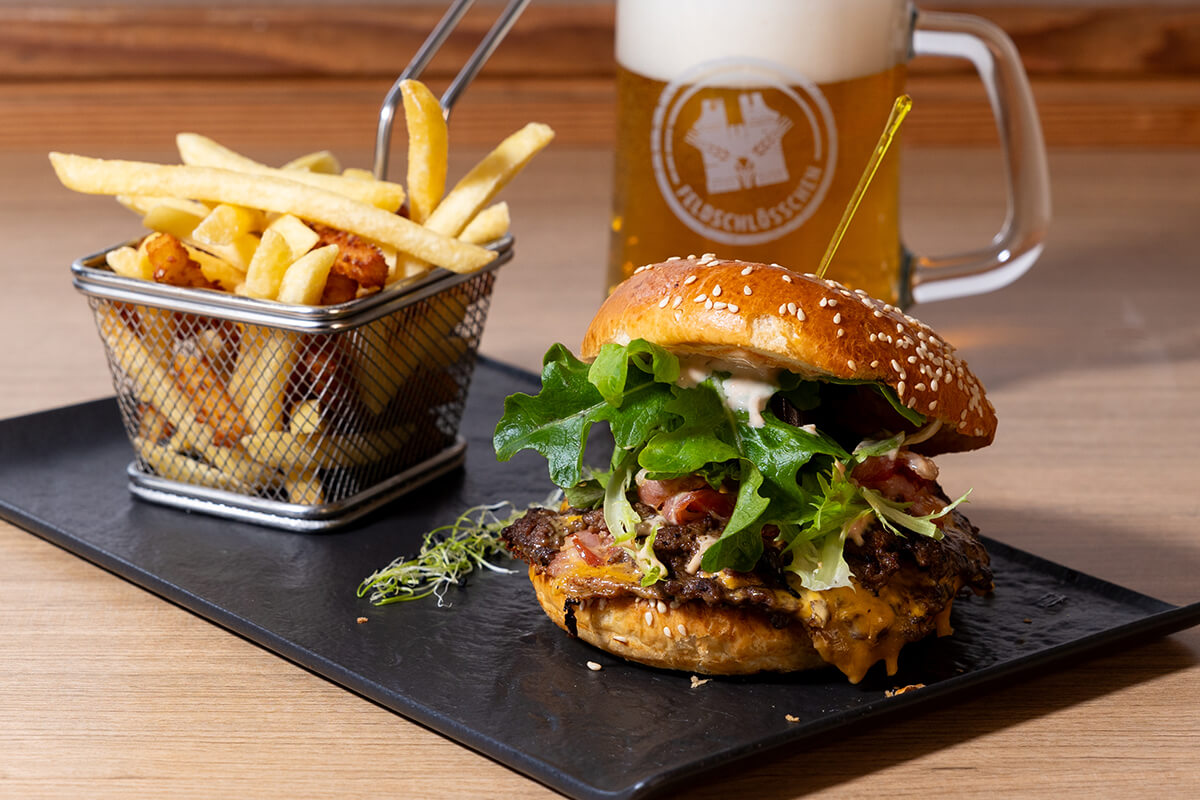 | PULLED PORK BURGER Pulled Pord, Speck, Cole Slaw Salat, Cheddar, Tomaten, Mayonnaise  |